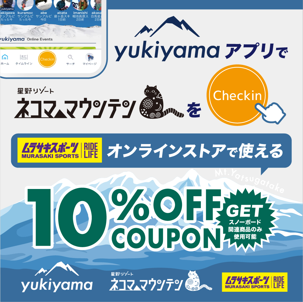星野リゾート ネコマ マウンテン 満喫キャンペーン!リフト券購入でムラサキスポーツ¥1,000クーポン必ず貰える! 「星野リゾート ネコママウンテンの電子チケットを購入すると、ムラサキスポーツオンラインストアで使える「¥1,000クーポン」を全員に、それに加え抽選で「磐梯山温泉ホテル by 星野リゾート ペア宿泊券」や「ムラポ ¥10,000ポイント」が当たるキャンペーン! ー 応募ページ ー SHARE! FEATURE 特集 FASHION ファッション SURF サーフ SNOW スノー SKATE スケート