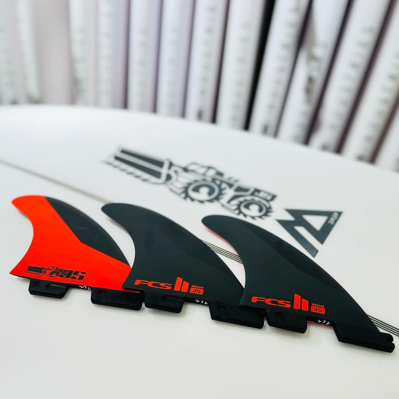JSサーフボードに最もマッチングするフィンとして【FCSⅡ】からリリースされている【JS 】PC CORE 5FINset(ジェイソン・スティーブンソン テンプレート)を準備する事でセッテイングの選択肢を広げる事が出来ます。ワンタッチでフィンを脱着できることでその場面の波コンディションに応じて簡単に素早くセットが可能です。小波や早く崩れるような波コンディションにおいてはスピード性の高いクアッドセッティングにすることで最大限にSUB XEROのポテンシャルを引き出し楽しむことができます。