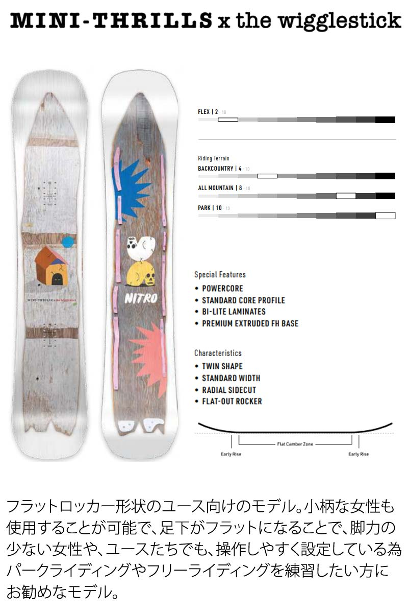 ミニスリルスノーボードは、ハイエンドのパークボードの乗り心地、ルックス、バイブをそのままに、キッズフレンドリーなフレックスパターンを採用。Mini Thrillsは若い世代がパークで活躍できるようにデザインされたボードです。