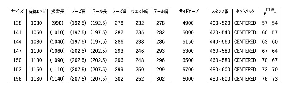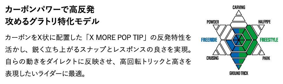 フラットロッカー形状によりノーズ・テールの引っかかりが少なく、プレスやグラトリの自由度も高い。