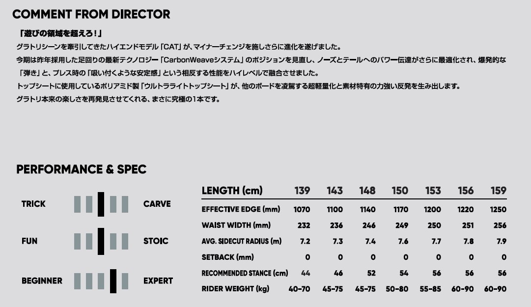 FNTCの中でも、グラトリ・パークスタイルを軸にトリック精度とキレのある動きを突き詰めたいライダーのために開発されたのがCAT。